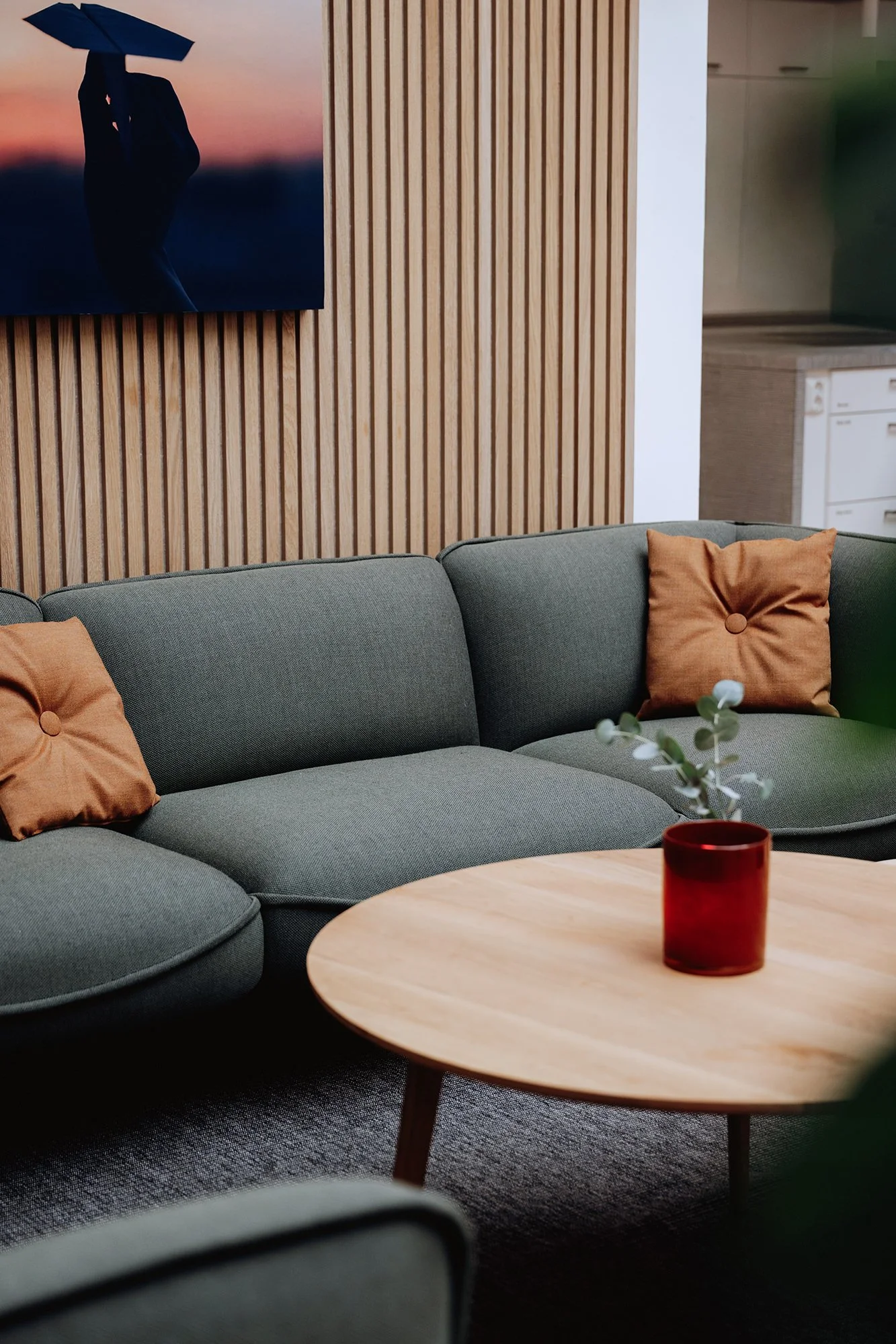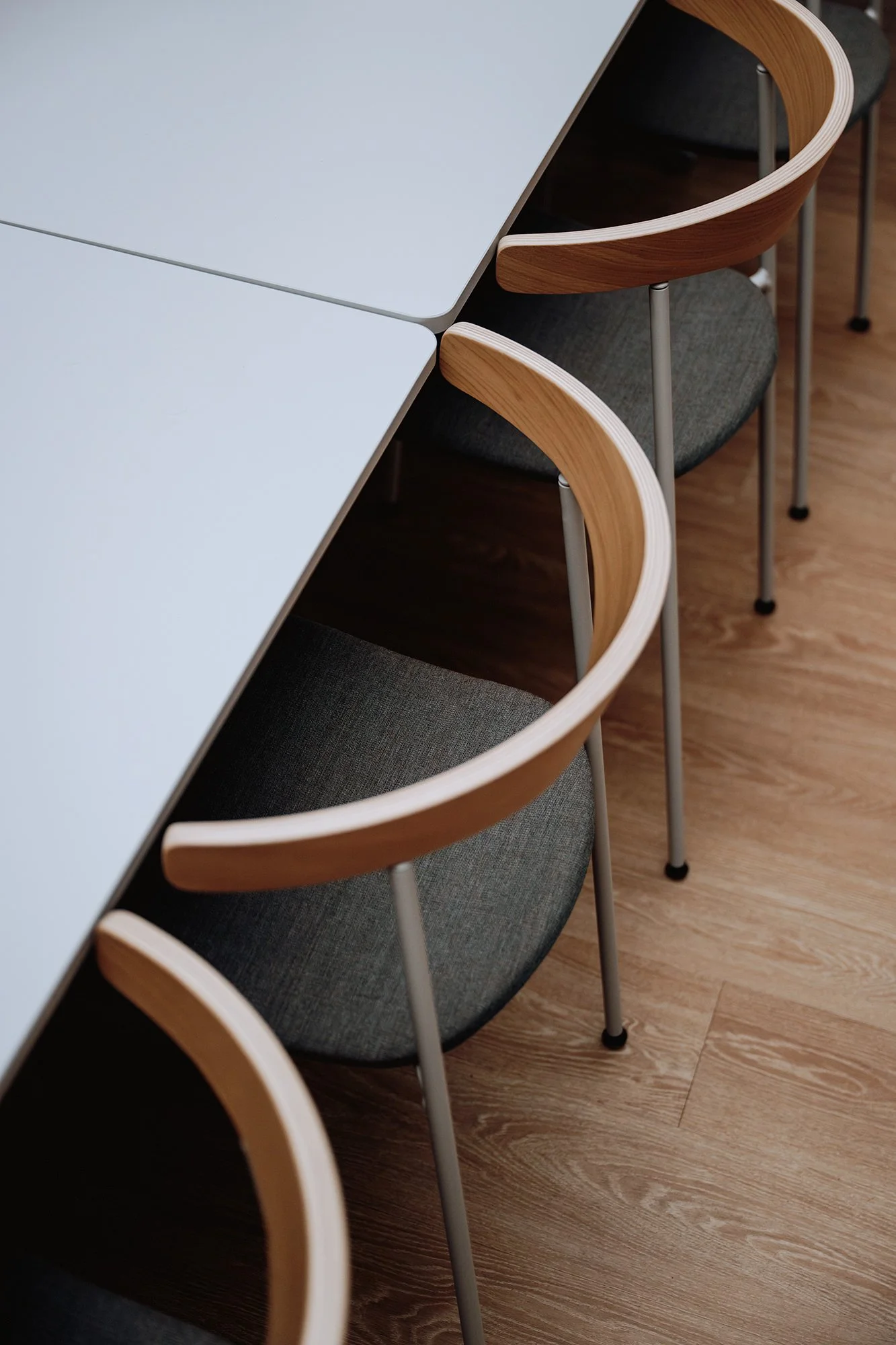Återbruk var en viktig del av arbetet. Befintliga mötesrumsbord lackerades om och ytor som behövde uppdateras folierades i stället för att ersättas. På så sätt kunde resurser sparas och livslängden förlängas – utan att kompromissa med helhetsintrycket.